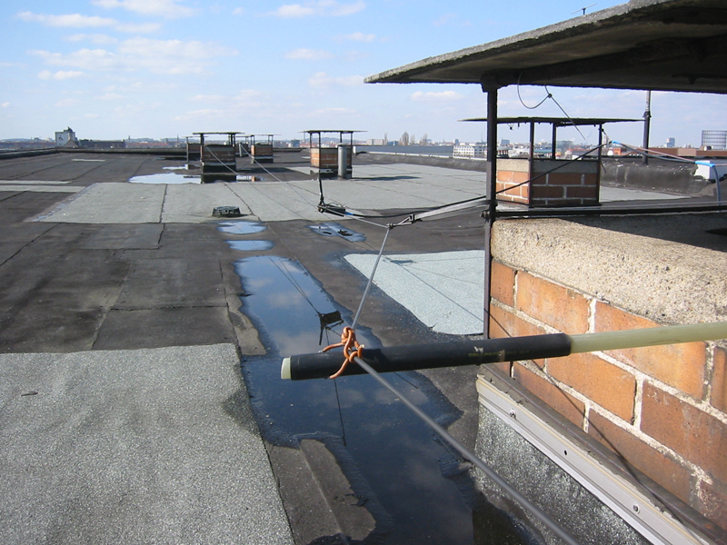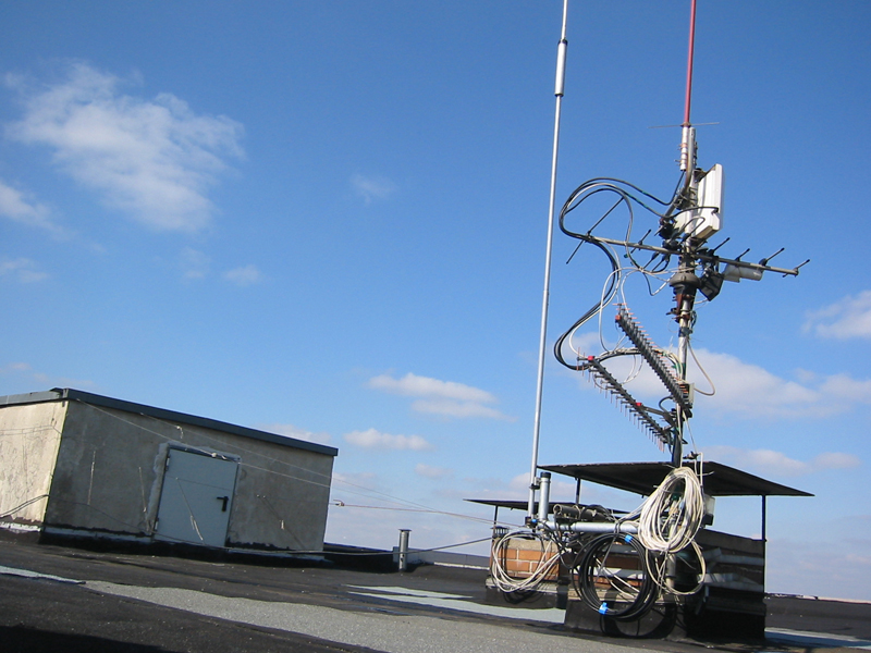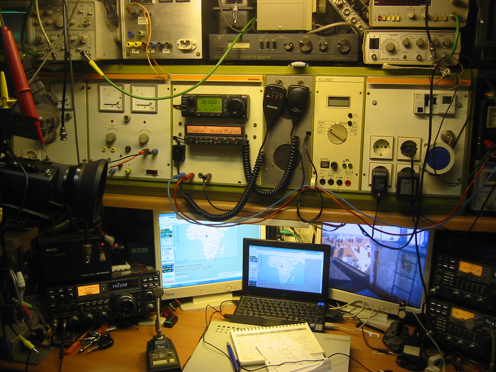Oben die Funkbude und unten dier Antennen (GPA 14-30MHZ, X5000 144-1200MHz, Planar 2300-2450MHz,Feedorn für 3400MHz ,Feedhorn 10000-10500MHz und Yagis für 144 , 1200 sowie 2300MHz.